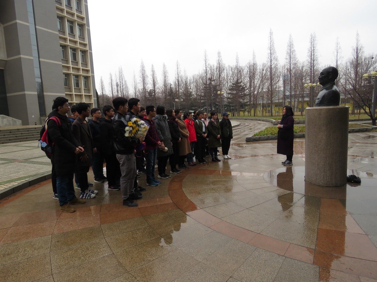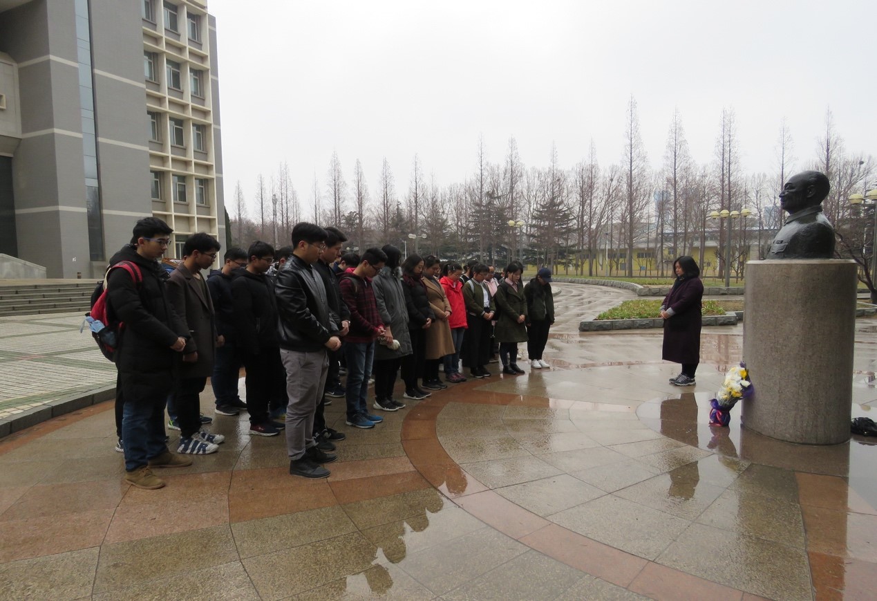默哀毕,学员们分别在主楼毛主席像前、屈伯川塑像前,听取了传承红色基因主题现场教学。关工委委员赵秋娜教授以主楼建设历史为主题,带领学员回顾大工创校的艰辛而光荣的历程,团委冯立芳老师以屈伯川老院长的生平故事为主题,带领学员走进屈伯川老院长励志求学报国、创校建校的动人事迹,让广大学员身临其境地接受红色基因教育。